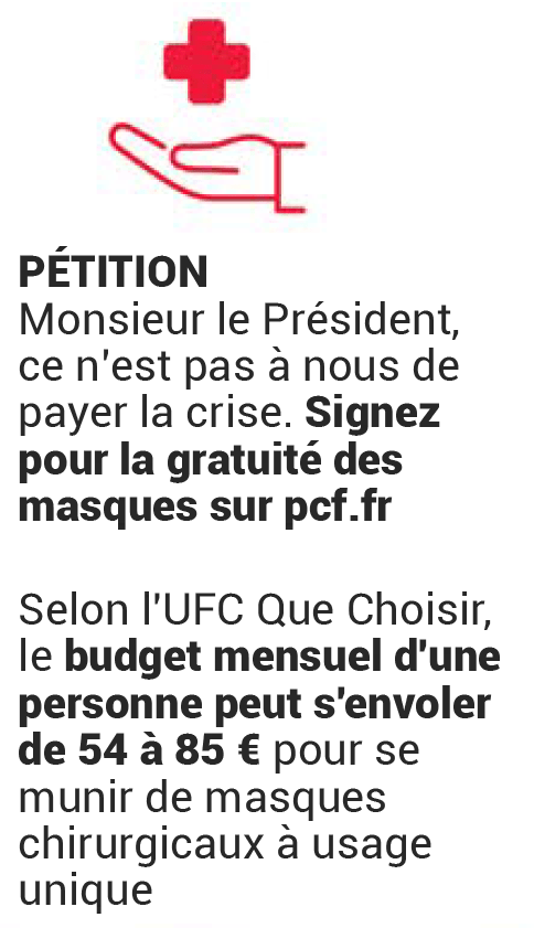 Les masques chirurgicaux sont un moyen de protection civile et collective et un outil de santé publique. Étalés aux caisses des supermarchés, ils ont rapporté 175 millions de bénéfice à la grande distribution en 10 semaines, selon l’analyse de l’Institut Nielsen. Vendus à 7 cents/pièce avant le Covid-19, l’État a fixé leur prix maximum à 95 cents/pièce depuis le passage au statut de pandémie. Et pourtant les masques doivent être gratuits ! C’est une exigence portée par le Parti communiste français et ses élus depuis avril 2020.
