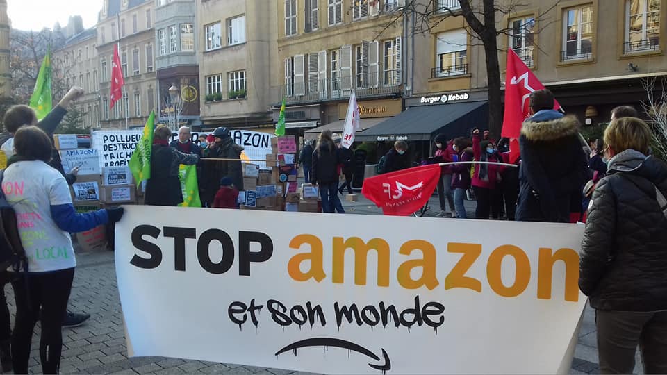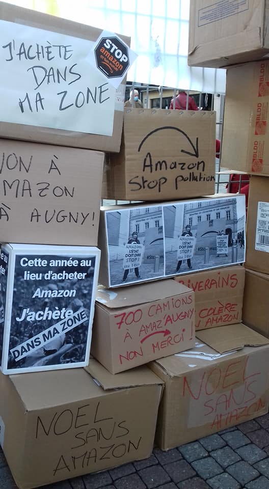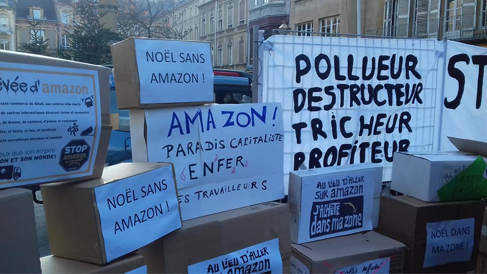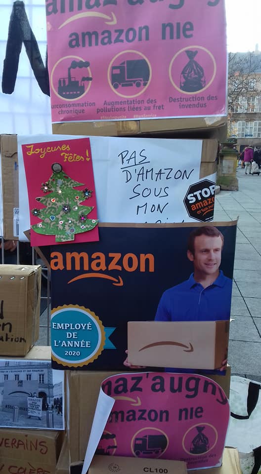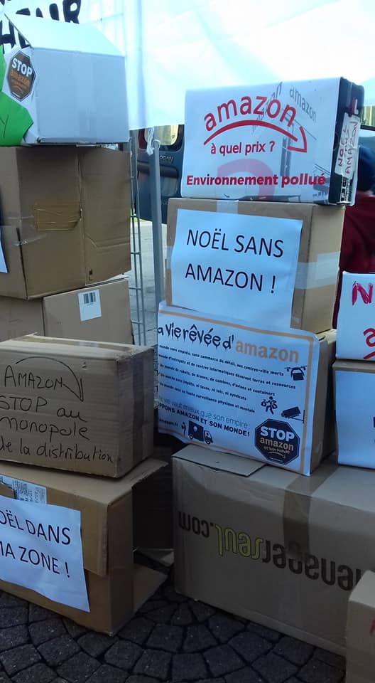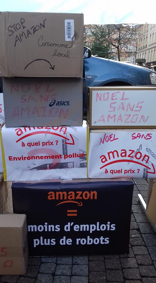 Pas d’Amazon sous le sapin ! Le collectif Stop Amazon d’Augny a organisé un rassemblement, samedi 26 novembre à Metz, pour appeler les citoyens à boycotter la plateforme de vente en ligne et à soutenir les commerçants locaux pour les fêtes (et après…). Un mur de cartons symboliques, couvert de messages militants, s’est dressé sur la Place Saint-Jacques et des chants de Noël adressés à M. Macron et à ses amis milliardaires ont retenti, alors que les commerces commençaient à ouvrir leurs portes. Les communistes de Moselle ont répondu présent pour soutenir cette nécessaire initiative à retrouver en vidéo.
