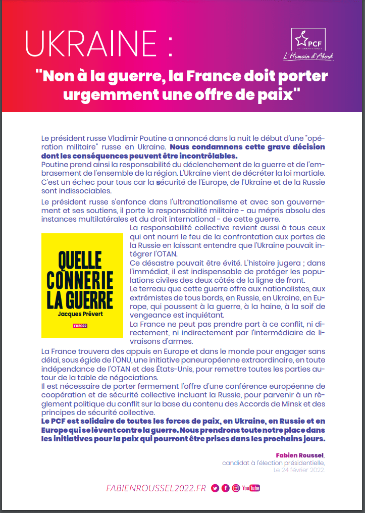 Le PCF est solidaire de toutes les forces de paix, en Ukraine, en Russie et en Europe qui se lèvent contre la guerre. Nous prendrons toute notre place dans les initiatives pour la paix qui pourront être prises dans les prochains jours.