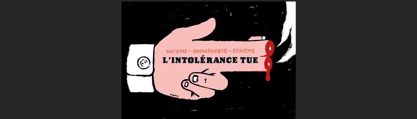 Image de couverture : « L’intolérance tue » est une affiche portant le symbole de notre lutte contre toutes les formes de haines et de discriminations, dessinée par Dugudus en 2003